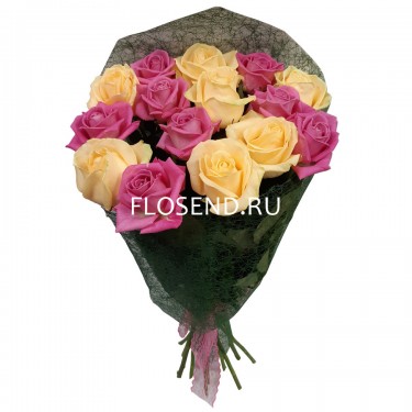 Букет «15 кремовых и розовых роз»